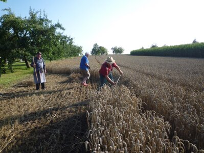 Begleiten Sie uns bei einer spannenden Zeitreise: Sensen, Garbenbinden von Hand oder mit einem Selbstbinder und in Hocken aufstellen, Einsatz eines historischen Mähdreschers – wie all dasfunktioniert, führen wir Ihnen gerne vor.